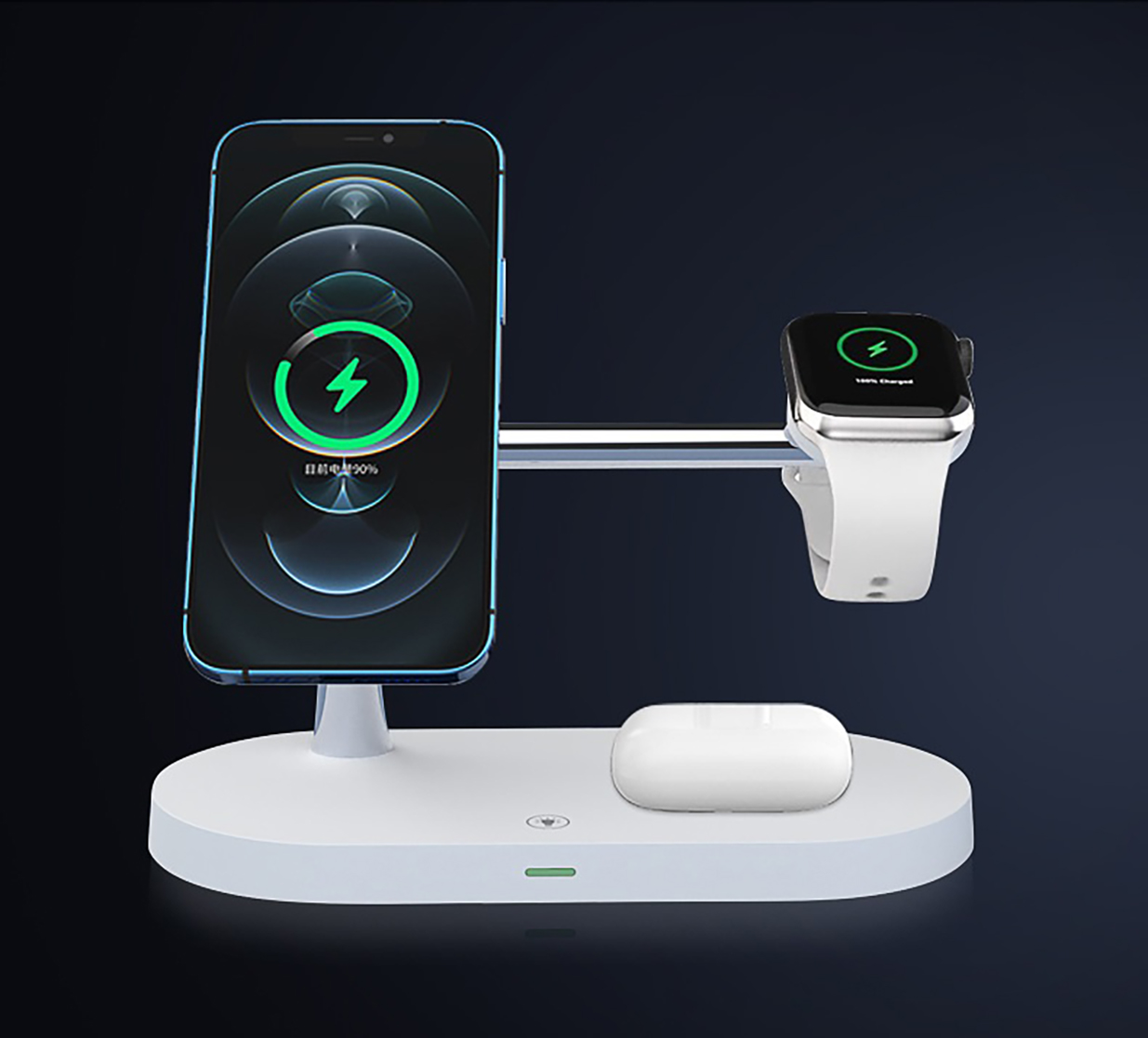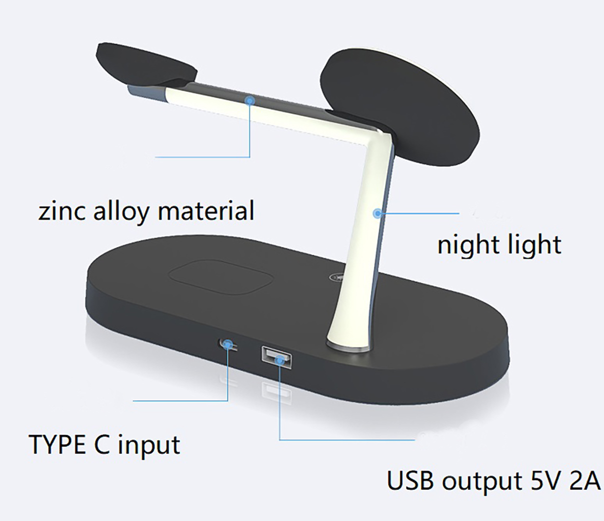 Univerzální bezdrátová nabíječka 5v1 umožňuje současné nabíjení telefonu, hodinek, sluchátek a dalších zařízení v elegantním kompaktním provedení. Tělo nabíječky je vyrobeno z kombinace ABS plastu a zinkové slitiny, což zaručuje pevnost, dlouhou životnost a elegantní vzhled. Nabízí výkon, styl i praktičnost v jednom — ideální pro domácí i kancelářské použití. Integrované LED noční světlo s výkonem 2 W vytváří příjemnou atmosféru při večerním používání. Dostupné barvy: bílá nebo černá.