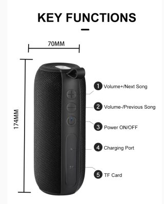 Prenosný bluetooth reproduktor s modernou technológiou BT 5.3 je navrhnutý pre stabilné bezdrôtové pripojenie a kvalitný zvukový výkon. Dva vstavané reproduktory s výkonom 2×5 W poskytujú vyvážený a dostatočne hlasný zvuk pre počúvanie doma aj vonku. Vodeodolné prevedenie s krytím IPX6 umožňuje použitie aj v náročnejších podmienkach. Reproduktor podporuje prehrávanie hudby z TF karty, handsfree telefonovanie a funkciu TWS, ktorá umožňuje bezdrôtové prepojenie dvoch reproduktorov do stereo zostavy. Vstavaná batéria s kapacitou 2 500 mAh ponúka až 6 hodín prehrávania na jedno nabitie. Vďaka vodeodolnosti IPX6 je vhodný aj na vonkajšie použitie, napríklad na terasu, k bazénu alebo na cesty.